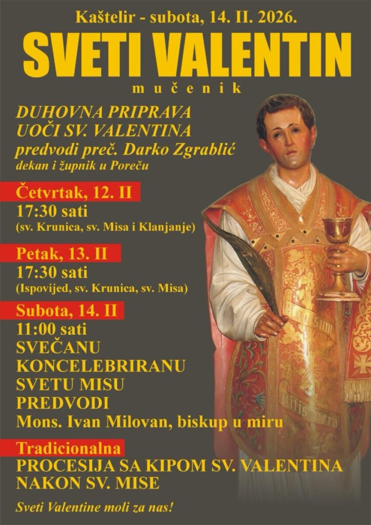 Subota 14.02.2026. naša župa u Kašteliru tradicionalno slavi blagdan Sv. Valentina a prije toga 12.02. i 13.02. imamo duhovnu pripravu! Svi ste pozvani i dobro